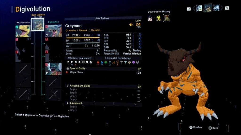 Um dos grandes trunfos do jogo é a liberdade de digivolução não-linear. A cada evolução, o Digimon herda parte dos stats acumulados, o que cria um incentivo para experimentar diferentes caminhos, evoluir e de-evoluir.